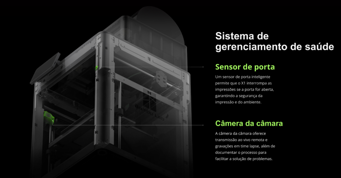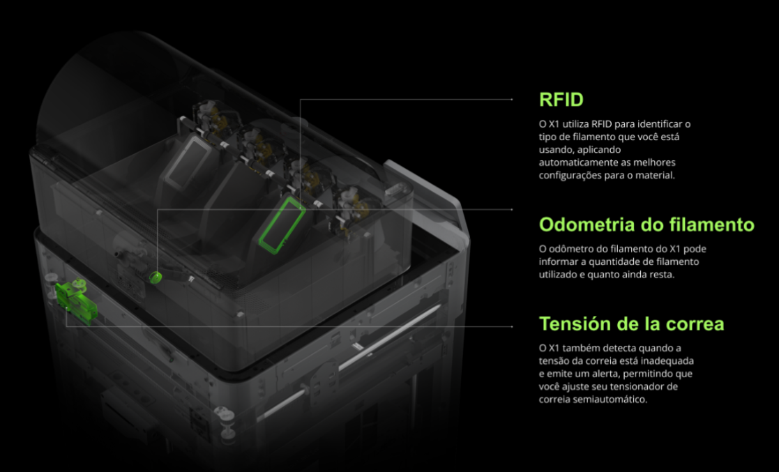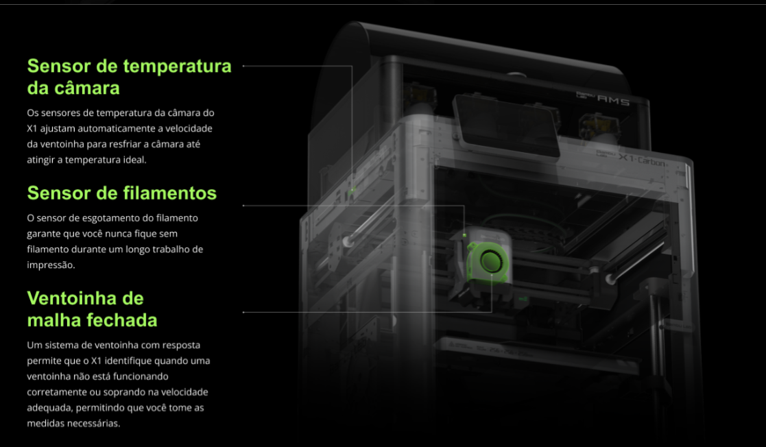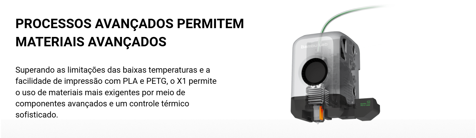 Filamento Suportado: PLA, PETG, TPU, ABS, ASA, PVA, PET. Ideal para PA, PC, polímero reforçado com fibra de carbono/vidro
